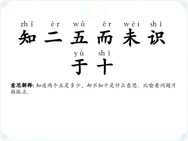 | 知二五而不知十 | 知道两个五是多少,却不知十是什么意思。比喻看问题片面孤立。 |