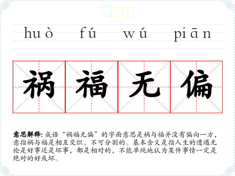成语“祸福无偏”的字面意思是祸与福并没有偏向一方,意指祸与福是相互交织、不可分割的。基本含义是指人生的遭遇无论是好事还是坏事,都是相对的,不能单纯地认为某件事情一定是绝对的好或坏。