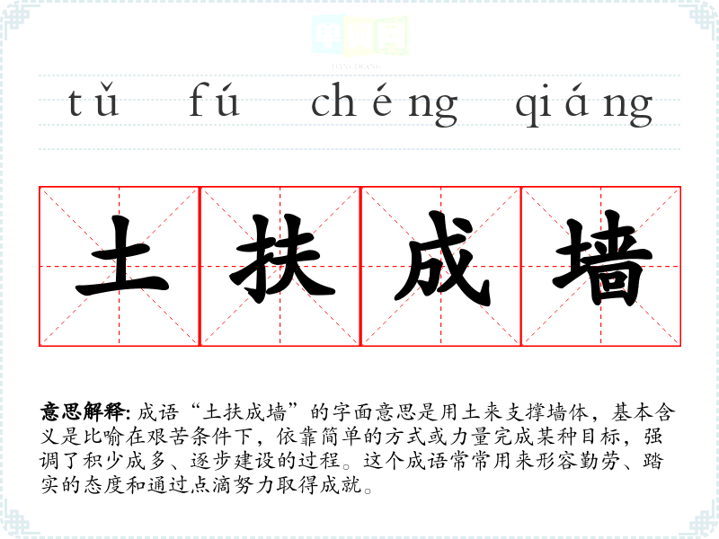 成语“土扶成墙”的字面意思是用土来支撑墙体,基本含义是比喻在艰苦条件下,依靠简单的方式或力量完成某种目标,强调了积少成多、逐步建设的过程。这个成语常常用来形容勤劳、踏实的态度和通过点滴努力取得成就。