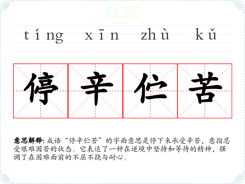 - 反义成语:一帆风顺、心急火燎、逃避现实。这些成语则表达了轻松、急躁或逃避的态度,与“停辛伫苦”形成鲜明对比。