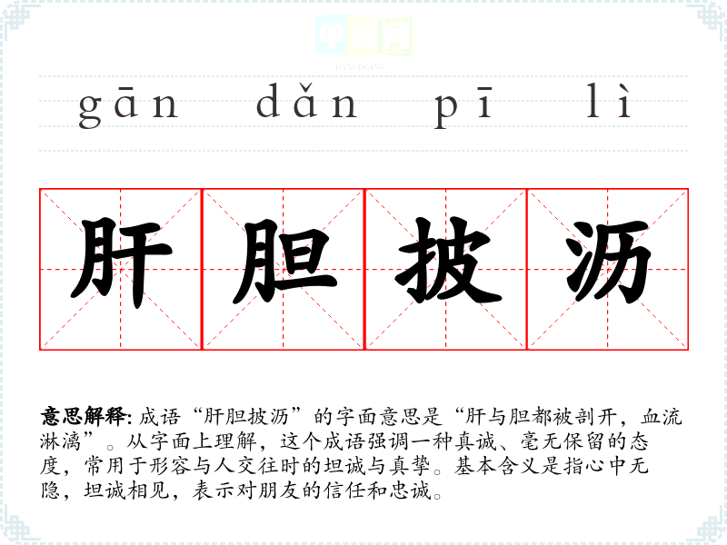 成语“肝胆披沥”的字面意思是“肝与胆都被剖开,血流淋漓”。从字面上理解,这个成语强调一种真诚、毫无保留的态度,常用于形容与人交往时的坦诚与真挚。基本含义是指心中无隐,坦诚相见,表示对朋友的信任和忠诚。