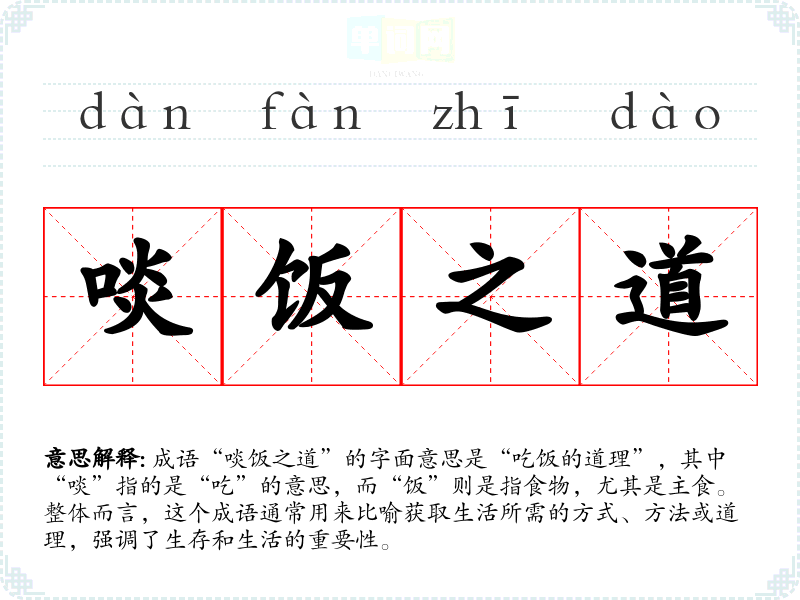 成语“啖饭之道”的字面意思是“吃饭的道理”,其中“啖”指的是“吃”的意思,而“饭”则是指食物,尤其是主食。整体而言,这个成语通常用来比喻获取生活所需的方式、方法或道理,强调了生存和生活的重要性。