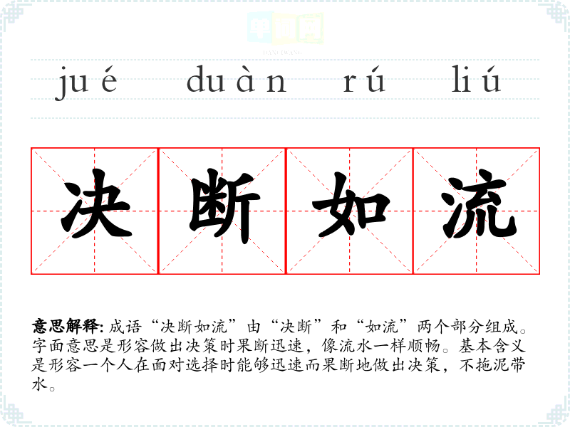 成语“决断如流”由“决断”和“如流”两个部分组成。字面意思是形容做出决策时果断迅速,像流水一样顺畅。基本含义是形容一个人在面对选择时能够迅速而果断地做出决策,不拖泥带水。