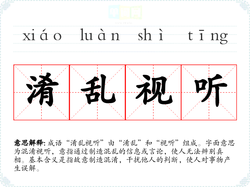 “淆乱视听”没有明确的历史典故,但其构成的两个词“淆乱”和“视听”在古文中常见。淆乱指的是混杂、扰乱,而视听则指视觉和听觉,通常用来形容人们对信息的感知。这个成语反映了对信息传播的关注,尤其是在政治和社会环境中。