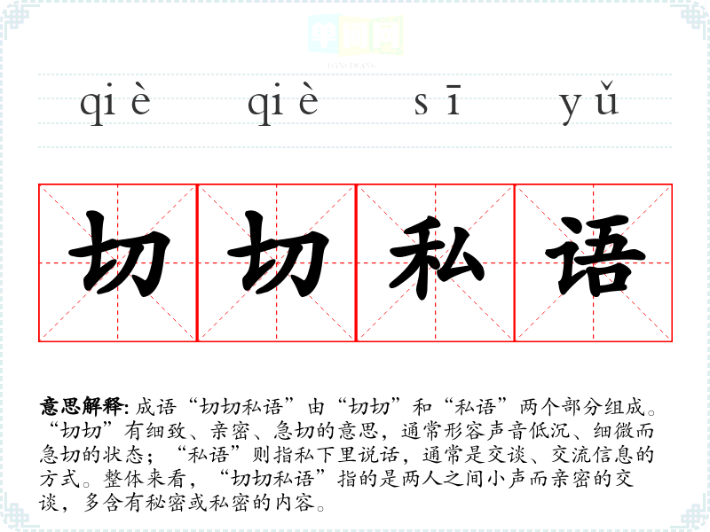 成语“切切私语”由“切切”和“私语”两个部分组成。“切切”有细致、亲密、急切的意思,通常形容声音低沉、细微而急切的状态;“私语”则指私下里说话,通常是交谈、交流信息的方式。整体来看,“切切私语”指的是两人之间小声而亲密的交谈,多含有秘密或私密的内容。