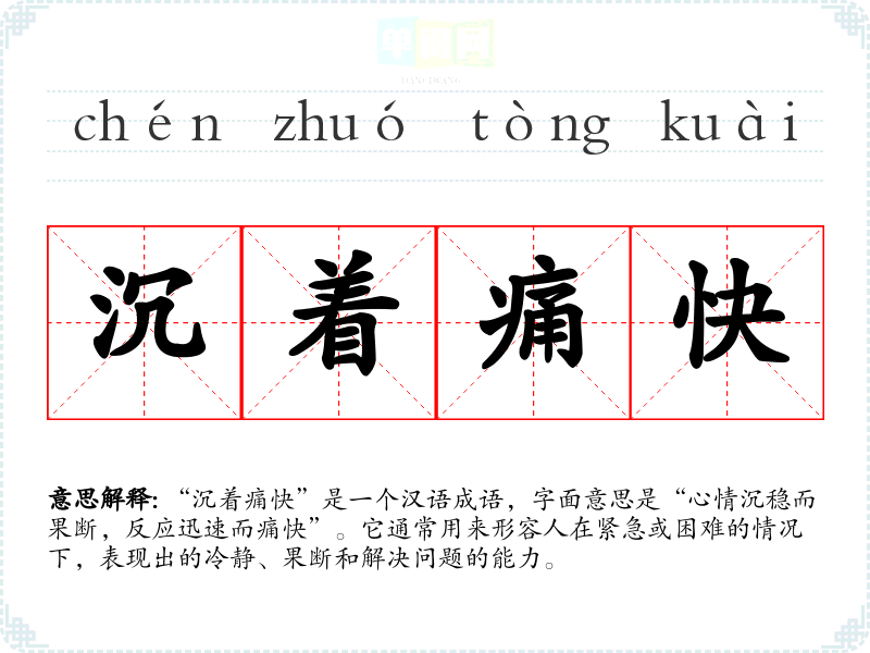 “沉着痛快”是一个汉语成语,字面意思是“心情沉稳而果断,反应迅速而痛快”。它通常用来形容人在紧急或困难的情况下,表现出的冷静、果断和解决问题的能力。