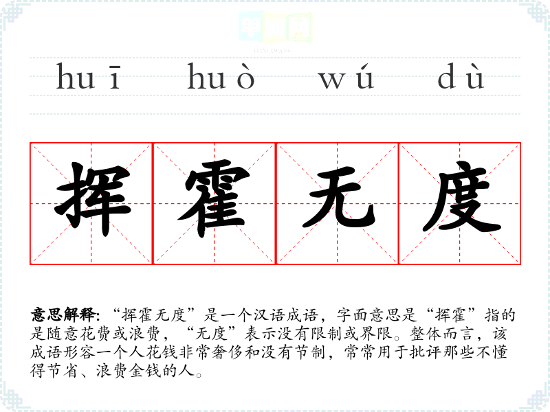 | 挥霍无度 | 挥霍:摇手称挥,反手称攉,意即动作敏捷,引伸为用钱没有节制;无度:没有限度。指滥用金钱,没有节制。 |