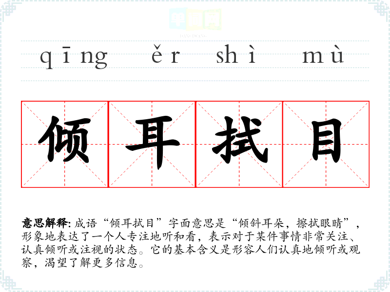 | 倾耳拭目 | 倾耳:侧着耳朵;拭目:擦眼睛。认真听,仔细看。表示急切想看到所期待的事物。 |