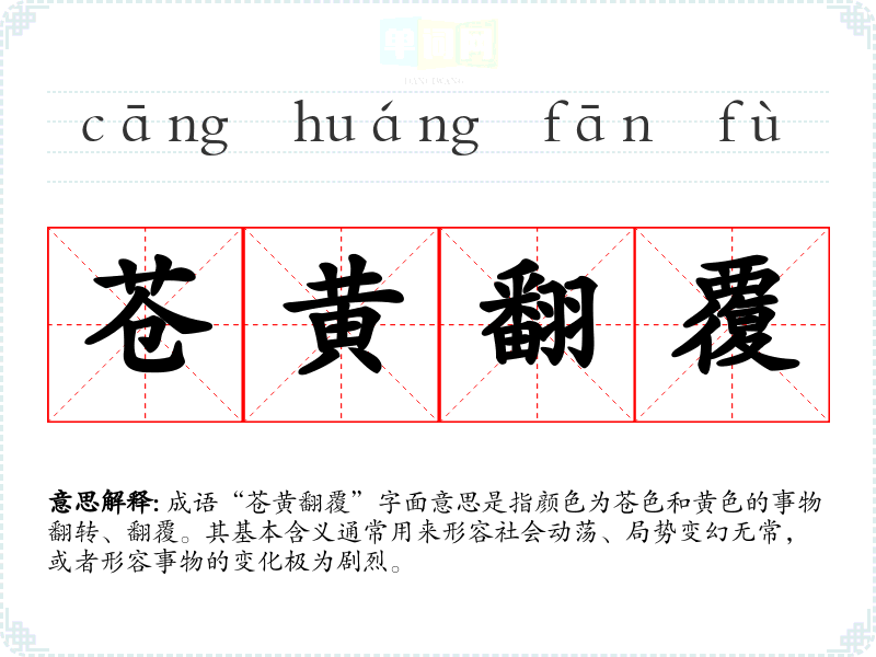 成语“苍黄翻覆”字面意思是指颜色为苍色和黄色的事物翻转、翻覆。其基本含义通常用来形容社会动荡、局势变幻无常,或者形容事物的变化极为剧烈。