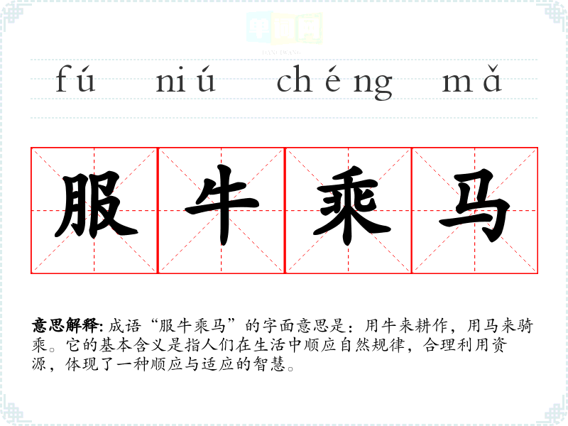 成语“服牛乘马”的字面意思是:用牛来耕作,用马来骑乘。它的基本含义是指人们在生活中顺应自然规律,合理利用资源,体现了一种顺应与适应的智慧。