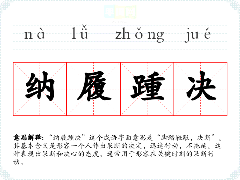 “纳履踵决”这个成语字面意思是“脚踏鞋跟,决断”。其基本含义是形容一个人作出果断的决定,迅速行动,不拖延。这种表现出果断和决心的态度,通常用于形容在关键时刻的果断行动。