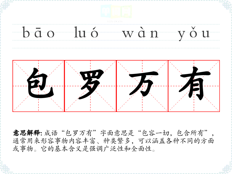 成语“包罗万有”字面意思是“包容一切,包含所有”,通常用来形容事物内容丰富、种类繁多,可以涵盖各种不同的方面或事物。它的基本含义是强调广泛性和全面性。