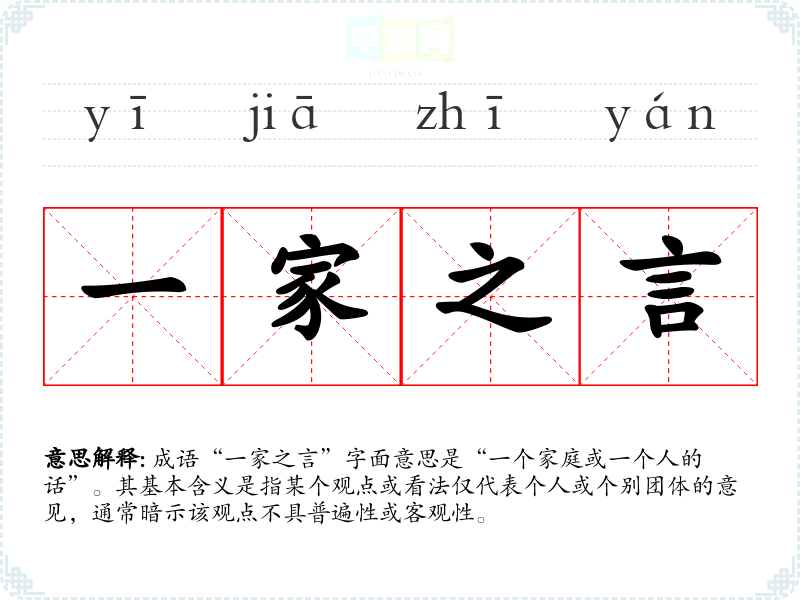 成语“一家之言”字面意思是“一个家庭或一个人的话”。其基本含义是指某个观点或看法仅代表个人或个别团体的意见,通常暗示该观点不具普遍性或客观性。