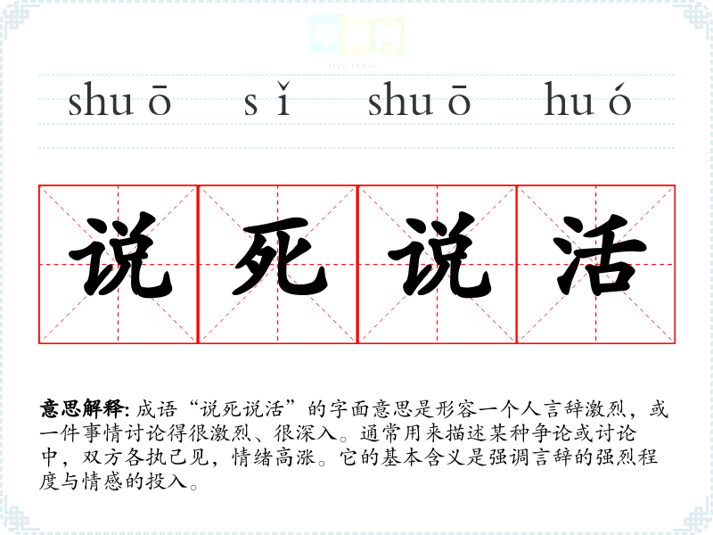 成语“说死说活”的字面意思是形容一个人言辞激烈,或一件事情讨论得很激烈、很深入。通常用来描述某种争论或讨论中,双方各执己见,情绪高涨。它的基本含义是强调言辞的强烈程度与情感的投入。