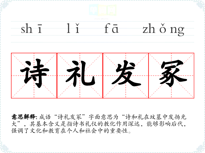 成语“诗礼发冢”字面意思为“诗和礼在坟墓中发扬光大”,其基本含义是指诗书礼仪的教化作用深远,能够影响后代,强调了文化和教育在个人和社会中的重要性。