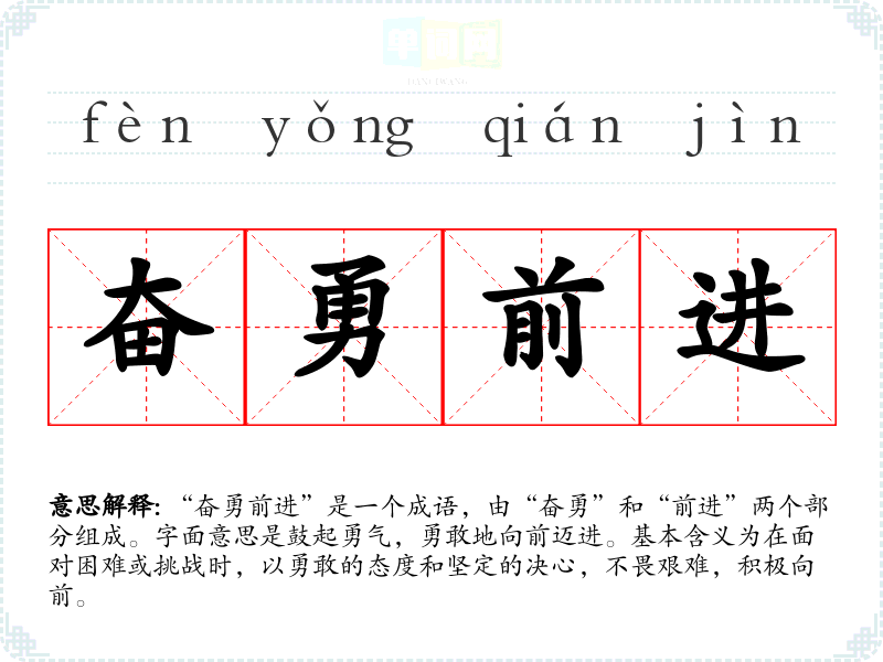 “奋勇前进”在*传统文化中,体现了勇气、坚韧和奋斗精神。在现代社会,这一成语常用于鼓励人们在事业、学和生活中勇于追求目标,尤其在面临挑战时。它在年轻一代中尤为流行,常作为励志口号。