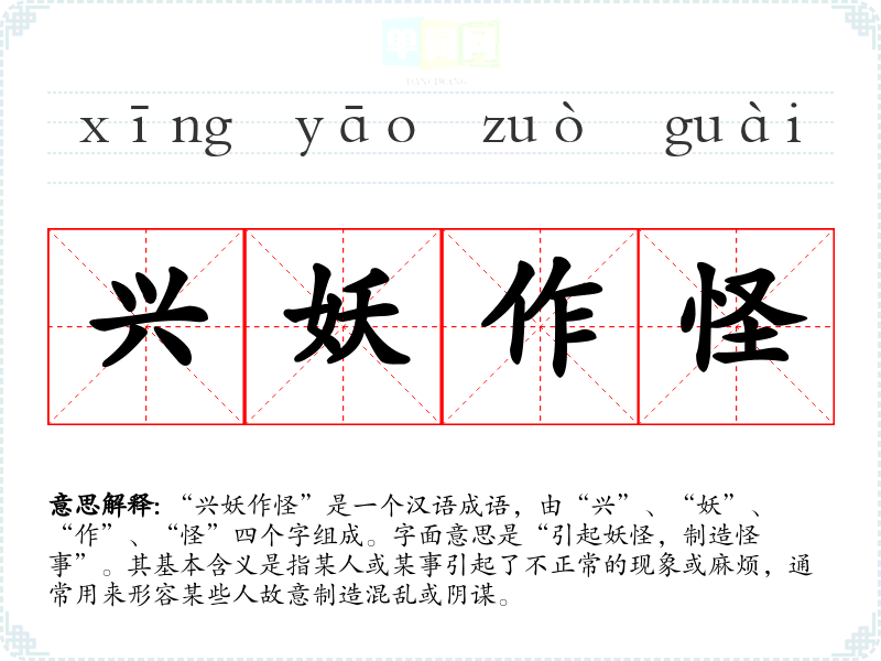 “兴妖作怪”是一个汉语成语,由“兴”、“妖”、“作”、“怪”四个字组成。字面意思是“引起妖怪,制造怪事”。其基本含义是指某人或某事引起了不正常的现象或麻烦,通常用来形容某些人故意制造混乱或阴谋。