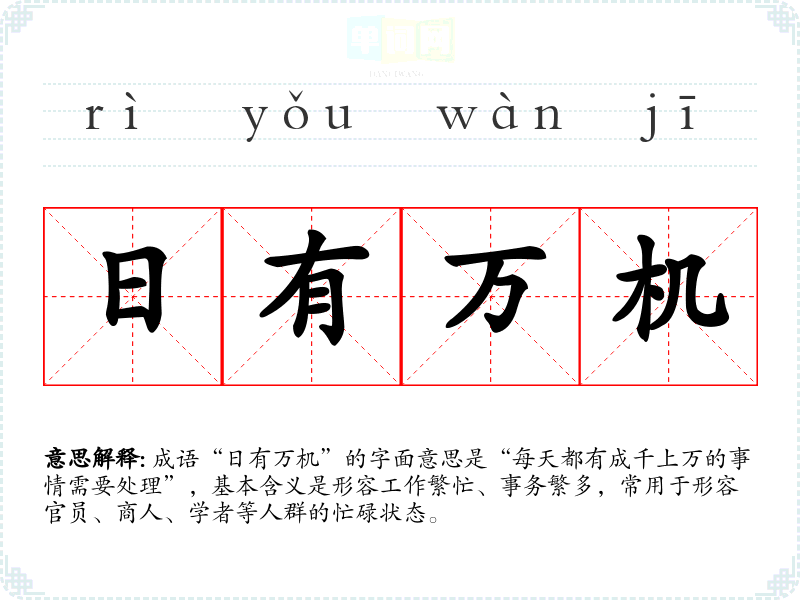 成语“日有万机”的字面意思是“每天都有成千上万的事情需要处理”,基本含义是形容工作繁忙、事务繁多,常用于形容官员、商人、学者等人群的忙碌状态。