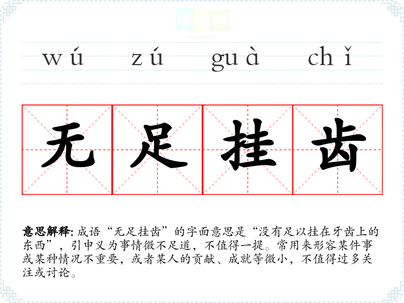 成语“无足挂齿”的字面意思是“没有足以挂在牙齿上的东西”,引申义为事情微不足道,不值得一提。常用来形容某件事或某种情况不重要,或者某人的贡献、成就等微小,不值得过多关注或讨论。