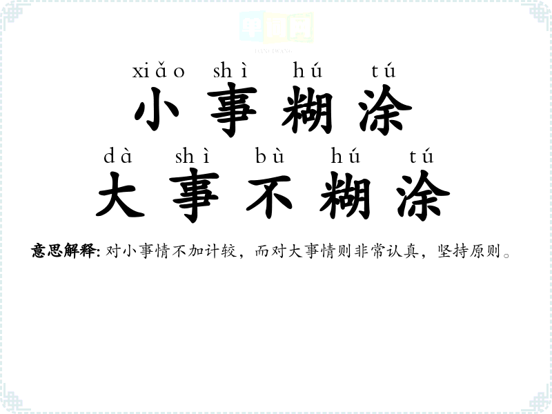 | 小事糊涂,大事不糊涂 | 对小事情不加计较,而对大事情则非常认真,坚持原则。 |