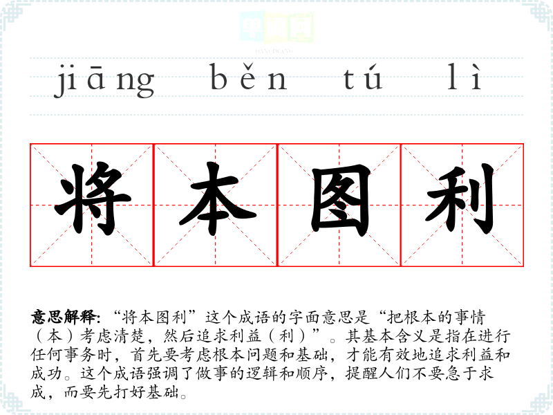 “将本图利”这个成语的字面意思是“把根本的事情(本)考虑清楚,然后追求利益(利)”。其基本含义是指在进行任何事务时,首先要考虑根本问题和基础,才能有效地追求利益和成功。这个成语强调了做事的逻辑和顺序,提醒人们不要急于求成,而要先打好基础。