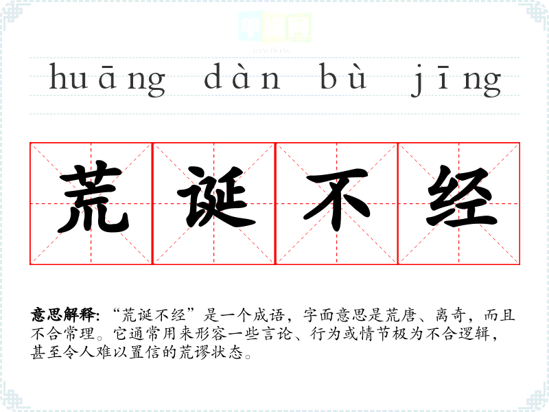 “荒诞不经”是一个成语,字面意思是荒唐、离奇,而且不合常理。它通常用来形容一些言论、行为或情节极为不合逻辑,甚至令人难以置信的荒谬状态。