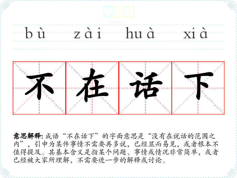 成语“不在话下”的字面意思是“没有在说话的范围之内”,引申为某件事情不需要再多说,已经显而易见,或者根本不值得提及。其基本含义是指某个问题、事情或情况非常简单,或者已经被大家所理解,不需要进一步的解释或讨论。