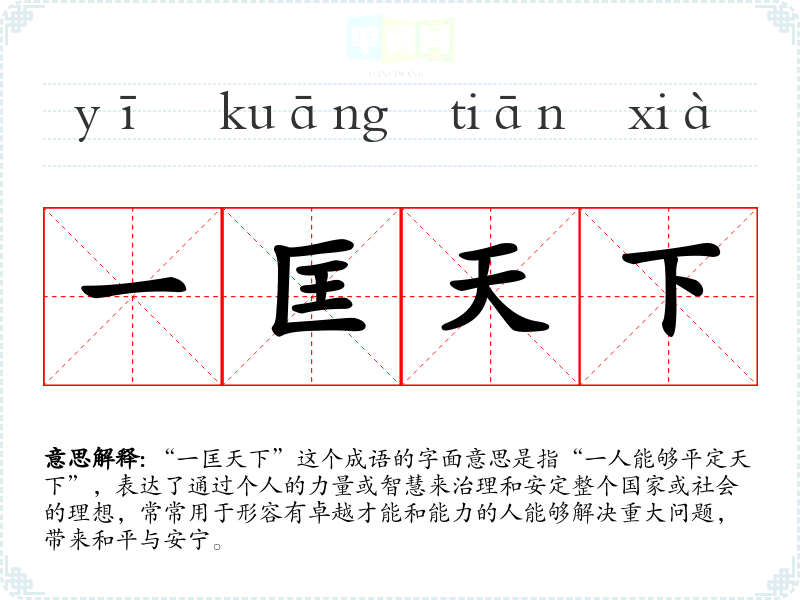 “一匡天下”这个成语的字面意思是指“一人能够平定天下”,表达了通过个人的力量或智慧来治理和安定整个国家或社会的理想,常常用于形容有卓越才能和能力的人能够解决重大问题,带来和平与安宁。
