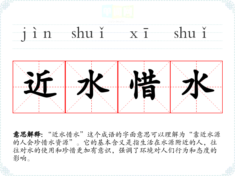 “近水惜水”这个成语的字面意思可以理解为“靠近水源的人会珍惜水资源”。它的基本含义是指生活在水源附近的人,往往对水的使用和珍惜更加有意识,强调了环境对人们行为和态度的影响。