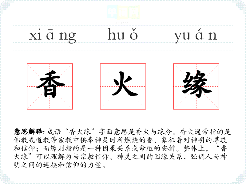 “香火缘”的具体历史来源并不明确,但其构成的两个部分在文化中都有着深厚的根基。香火在信仰中常常被用作祭祀的象征,代表着信徒对神灵的祈求和敬仰。而“缘”则是文化中常提到的概念,强调因果法则与人际关系。可以推测这一成语可能是在文化不断传播和发展的过程中形成的。