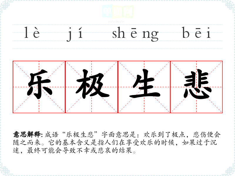 成语“乐极生悲”字面意思是:欢乐到了极点,悲伤便会随之而来。它的基本含义是指人们在享受欢乐的时候,如果过于沉迷,最终可能会导致不幸或悲哀的结果。