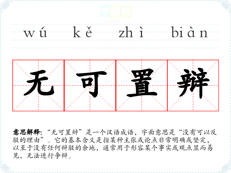 “无可置辩”是一个汉语成语,字面意思是“没有可以反驳的理由”。它的基本含义是指某种主张或论点非常明确或坚定,以至于没有任何辩驳的余地,通常用于形容某个事实或观点显而易见,无法进行争辩。