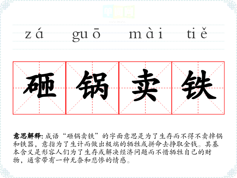 成语“砸锅卖铁”的字面意思是为了生存而不得不卖掉锅和铁器,意指为了生计而做出极端的牺牲或拼命去挣取金钱。其基本含义是形容人们为了生存或解决经济问题而不惜牺牲自己的财物,通常带有一种无奈和悲惨的情感。