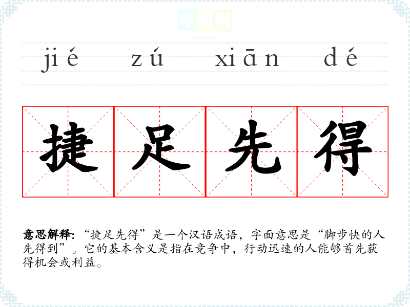 “捷足先得”是一个汉语成语,字面意思是“脚步快的人先得到”。它的基本含义是指在竞争中,行动迅速的人能够首先获得机会或利益。