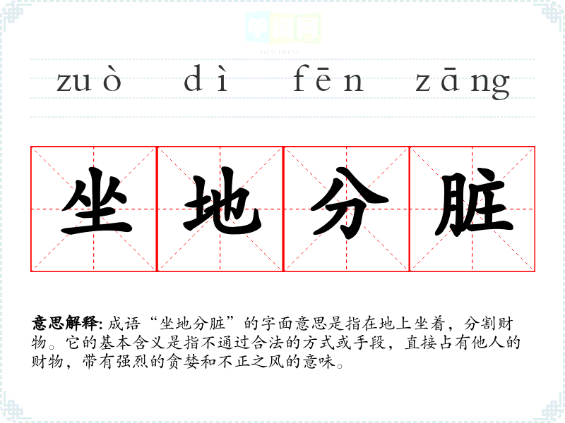 成语“坐地分脏”的字面意思是指在地上坐着,分割财物。它的基本含义是指不通过合法的方式或手段,直接占有他人的财物,带有强烈的贪婪和不正之风的意味。