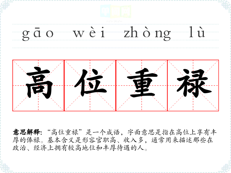 “高位重禄”是一个成语,字面意思是指在高位上享有丰厚的俸禄。基本含义是形容官职高、收入多,通常用来描述那些在政治、经济上拥有较高地位和丰厚待遇的人。