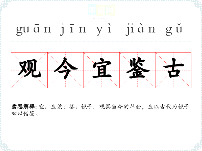 | 观今宜鉴古 | 宜:应该;鉴:镜子。观察当今的社会,应以古代为镜子加以借鉴。 |