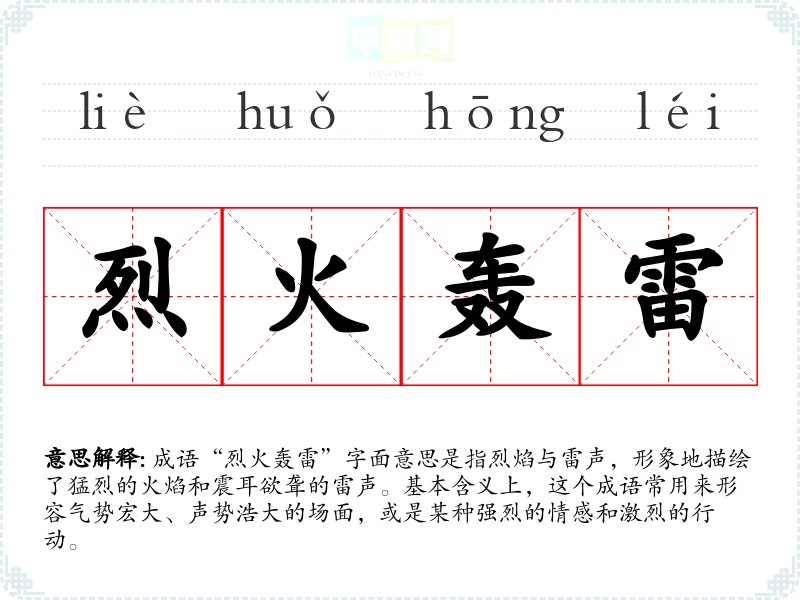 成语“烈火轰雷”字面意思是指烈焰与雷声,形象地描绘了猛烈的火焰和震耳欲聋的雷声。基本含义上,这个成语常用来形容气势宏大、声势浩大的场面,或是某种强烈的情感和激烈的行动。