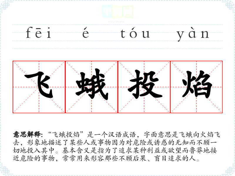 - 他为了追求名利,不顾一切,真是飞蛾投焰。