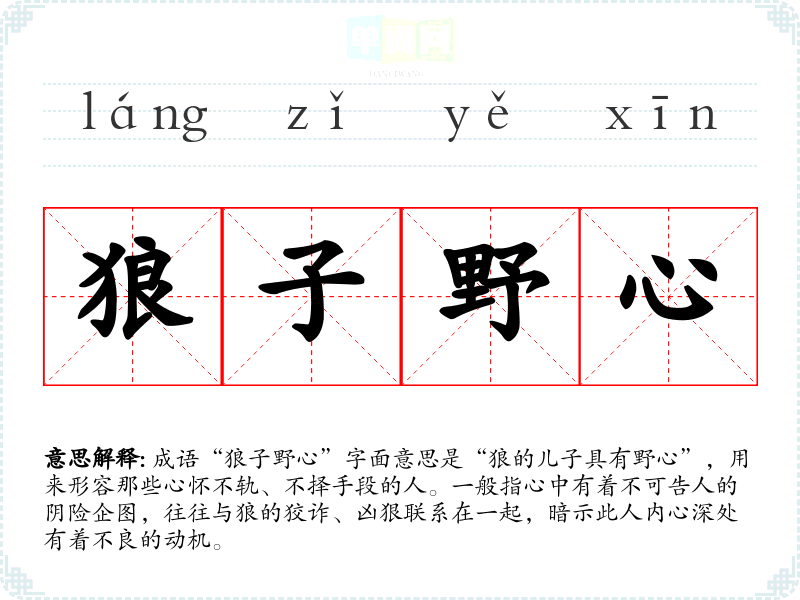 成语“狼子野心”字面意思是“狼的儿子具有野心”,用来形容那些心怀不轨、不择手段的人。一般指心中有着不可告人的阴险企图,往往与狼的狡诈、凶狠联系在一起,暗示此人内心深处有着不良的动机。
