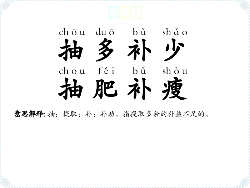 | 抽多补少,抽肥补瘦 | 抽:提取;补:补助。指提取多余的补益不足的。 |