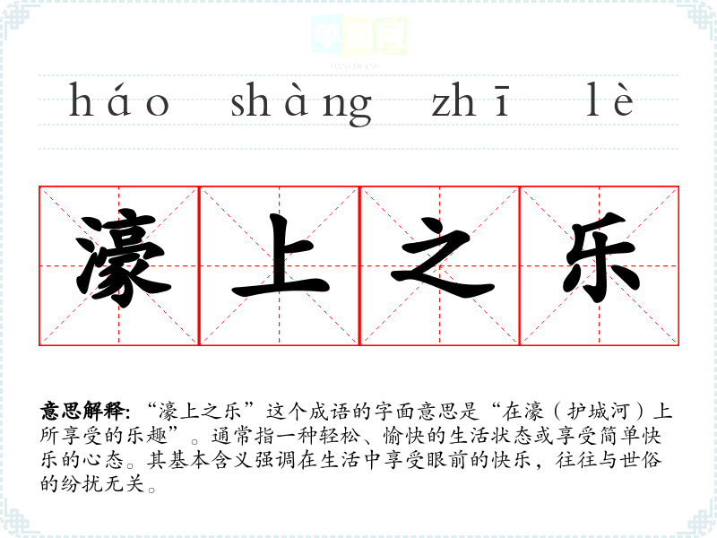 “濠上之乐”这个成语的字面意思是“在濠(护城河)上所享受的乐趣”。通常指一种轻松、愉快的生活状态或享受简单快乐的心态。其基本含义强调在生活中享受眼前的快乐,往往与世俗的纷扰无关。