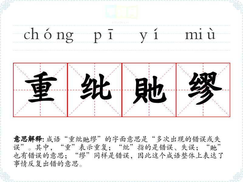 成语“重纰貤缪”的字面意思是“多次出现的错误或失误”。其中,“重”表示重复;“纰”指的是错误、失误;“貤”也有错误的意思;“缪”同样是错误,因此这个成语整体上表达了事情反复出错的意思。