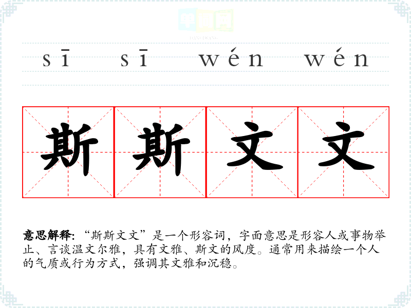 “斯斯文文”是一个形容词,字面意思是形容人或事物举止、言谈温文尔雅,具有文雅、斯文的风度。通常用来描绘一个人的气质或行为方式,强调其文雅和沉稳。