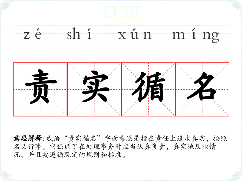 成语“责实循名”字面意思是指在责任上追求真实,按照名义行事。它强调了在处理事务时应当认真负责,真实地反映情况,并且要遵循既定的规则和标准。