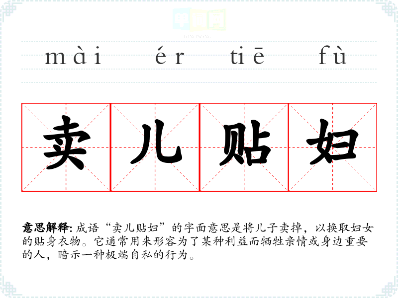 成语“卖儿贴妇”的字面意思是将儿子卖掉,以换取妇女的贴身衣物。它通常用来形容为了某种利益而牺牲亲情或身边重要的人,暗示一种极端自私的行为。