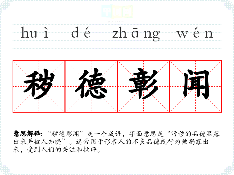 | 秽德彰闻 | 秽德:丑恶的品质和行为;彰:明显。丑恶的品质和行为已经为人所共知。 |