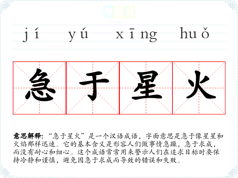 “急于星火”是一个汉语成语,字面意思是急于像星星和火焰那样迅速。它的基本含义是形容人们做事情急躁,急于求成,而没有耐心和细心。这个成语常常用来警示人们在追求目标时要保持冷静和谨慎,避免因急于求成而导致的错误和失败。