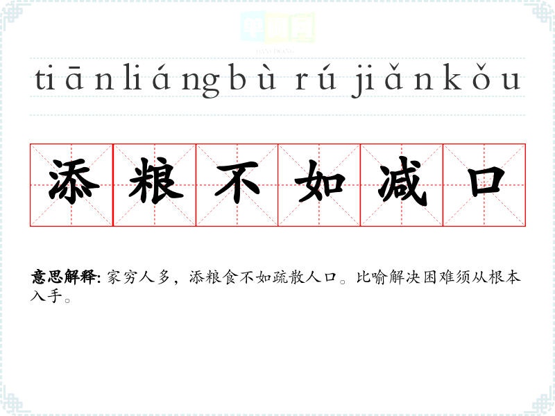 | 添粮不如减口 | 家穷人多,添粮食不如疏散人口。比喻解决困难须从根本入手。 |