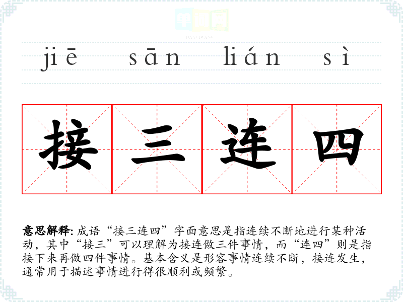 成语“接三连四”字面意思是指连续不断地进行某种活动,其中“接三”可以理解为接连做三件事情,而“连四”则是指接下来再做四件事情。基本含义是形容事情连续不断,接连发生,通常用于描述事情进行得很顺利或频繁。
